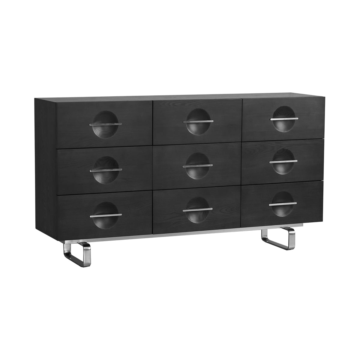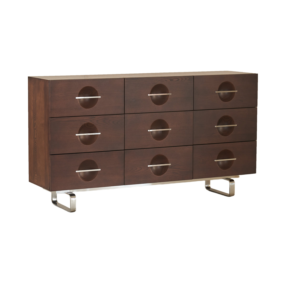 Inspired by the planets of the universe, the geometric shape of this sideboards and the rounded concave surfaces arrayed on the doors create a polished and elegant visual effect. The metal handles are also carefully cut and polished, emphasizing the language of cutting.